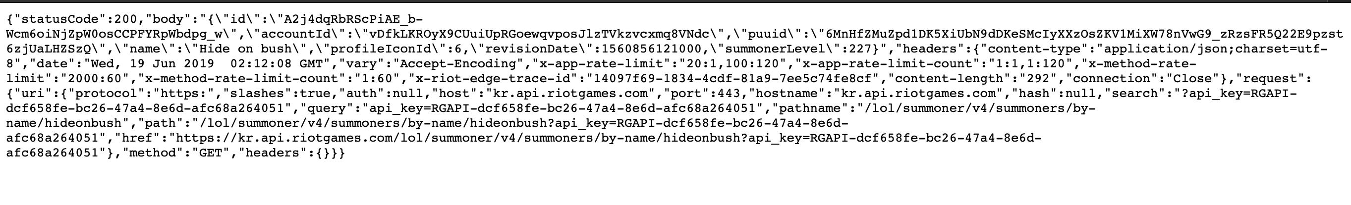 request(`https://kr.api.riotgames.com/lol/summoner/v4/summoners/by-name/hideonbush?api_key=발급받은key값`, function (error, res, body) {