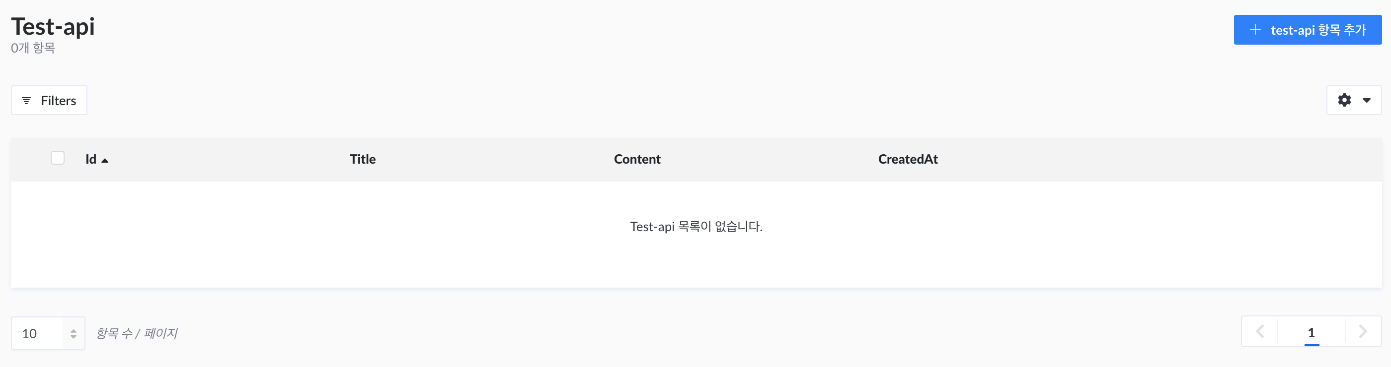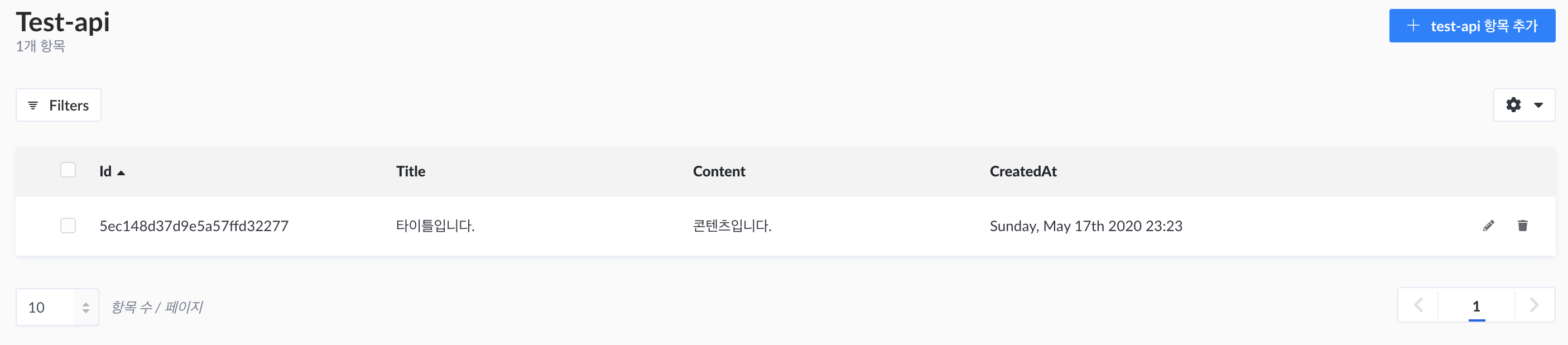 위의 test-api항목추가를 클릭하면 title과 Content를 입력하는 Input이 있습니다. 입력하고 싶은 내용을 마음대로 입력하고